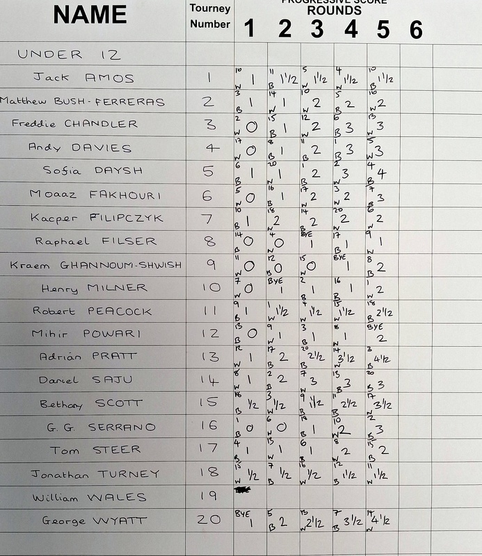 U12: 1st* George Wyatt 4½/5; 2nd* AD Pratt 4½/5; 3rd Sofia Daysh 4/5